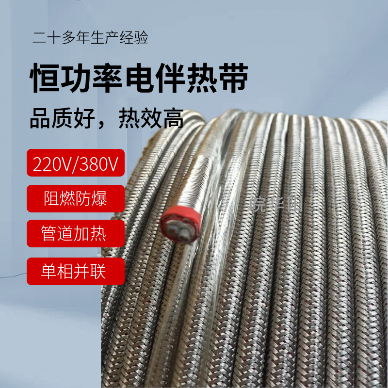 串聯式恒功率電伴熱帶:串聯式電伴熱帶是由絕緣銅絞線為電源母線,即為發熱芯線。具有一定內阻的芯線通過電流芯線就會產生焦耳熱量(焦耳--楞次定律Q=0.24I\S2^;Rt),其大小與電流平方、芯線阻值和通過時間成正比。因此串聯式電伴熱帶隨著通電時間的延續,源源不斷的發出熱量,形成一條連續的、均勻發熱的電伴熱帶。串聯式電伴熱帶芯線電流相同、電阻相等,所以整根電伴熱帶首尾發熱均勻,其輸出功率恒定不受環境溫度和管道溫度影響。